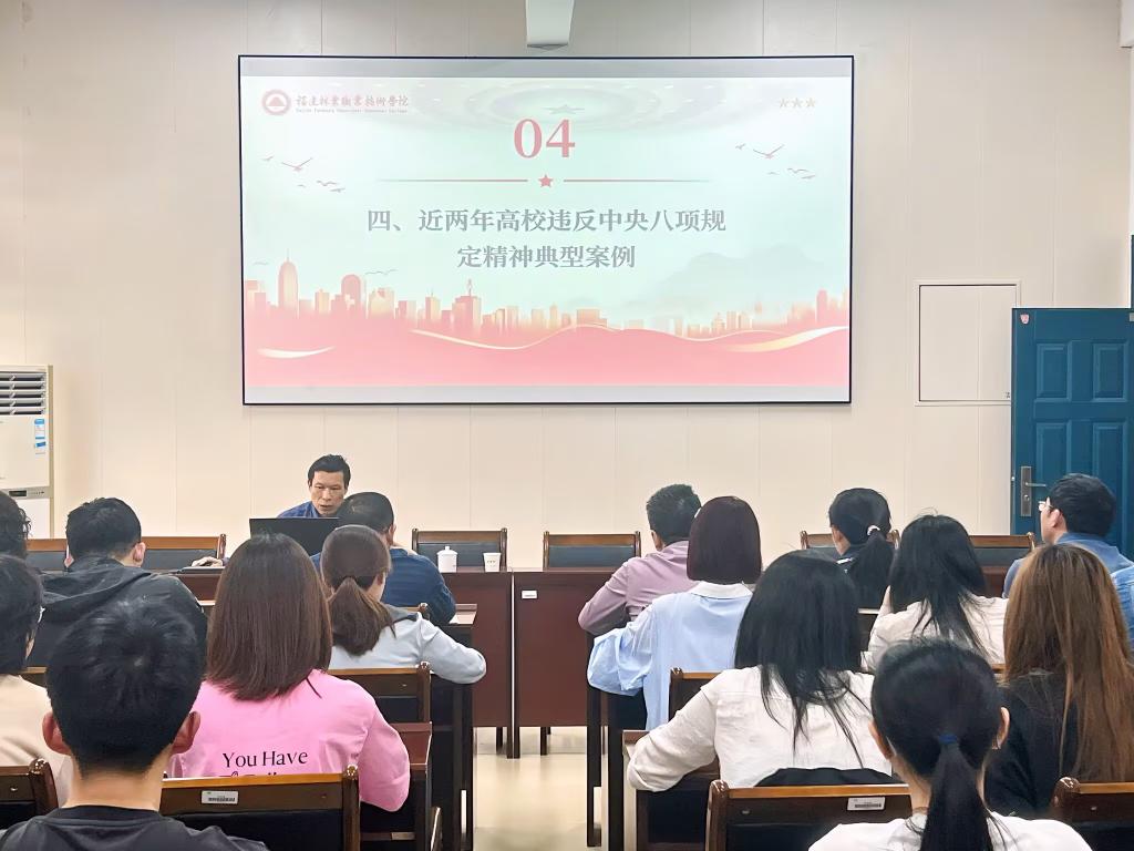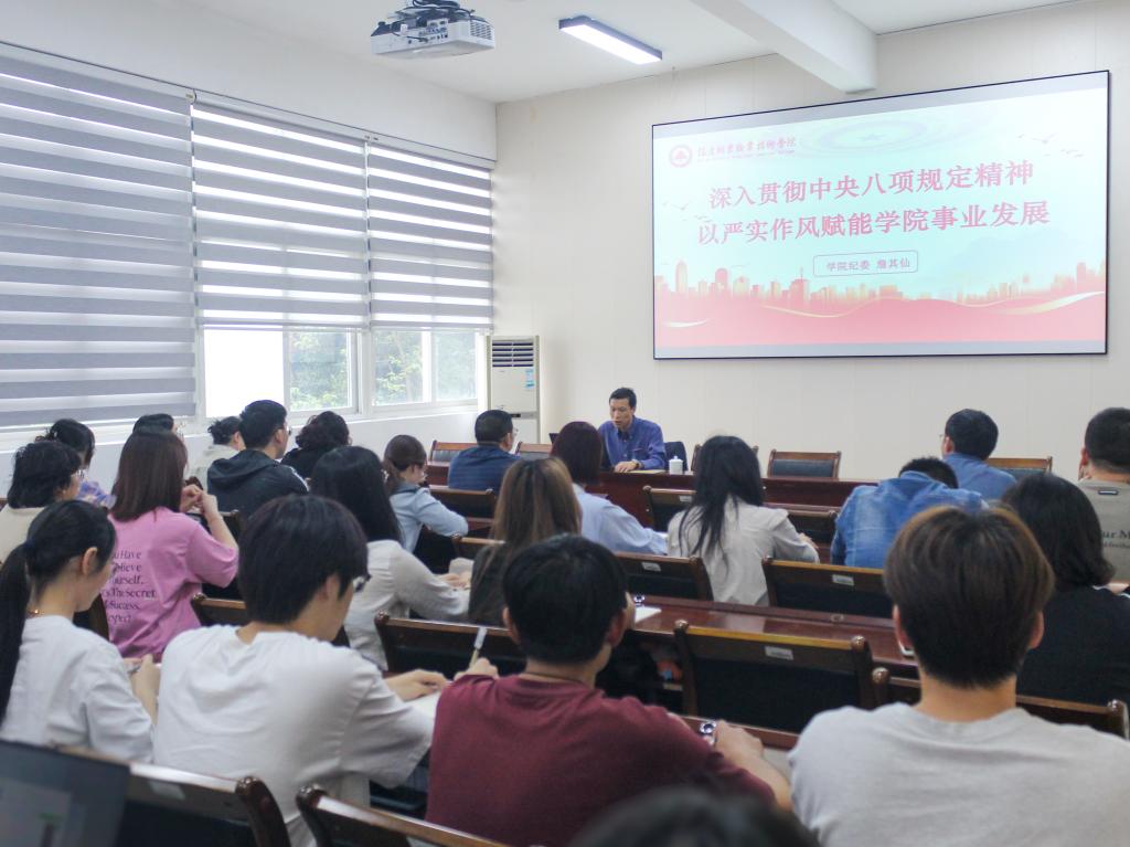 4月17日下午,院党委委员、院纪委书记詹其仙以“深入贯彻中央八项规定精神,以严实作风赋能学院事业发展”为题,为师生党员作深入贯彻中央八项规定精神学习教育专题党课宣讲。党课由信息工程系党总支书记、主任华建祥主持,院纪委办公室主任谢福荣、副主任薛莉、综合科科长彭韬,以及信息工程系全体师生党员共同参与此次学习。