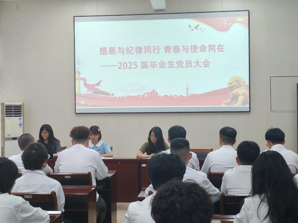 活动最后,学生第一党支部书记郑燕丽、学生第二党支部书记陈雅佳共同寄语毕业生党员。他们提出三点希望:一是常怀感恩之心,将个人理想融入党和国家事业;二是永葆奋进之志,在基层一线锤炼本领;三是绷紧纪律之弦,以清正廉洁赢得人生长跑。全体党员面向党旗重温入党誓词,铿锵誓言回荡在会场,更铭刻在每位毕业生党员心中。