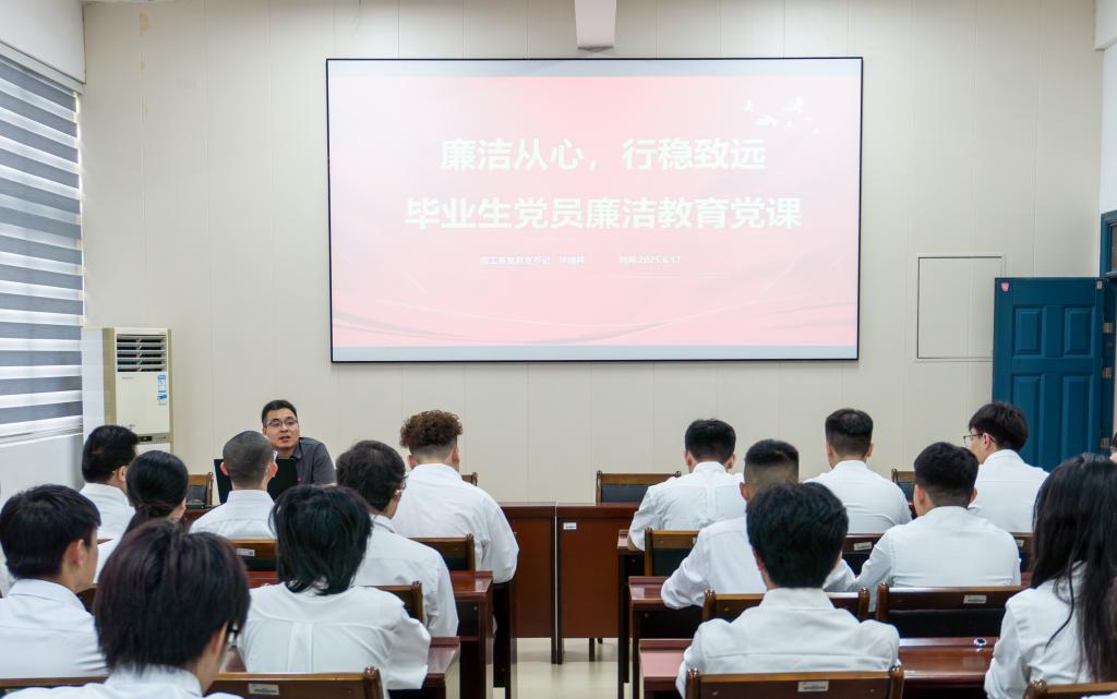 为开展好深入贯彻中央八项规定精神学习教育,强化毕业生党员廉洁意识,筑牢职场廉洁防线,6月17日下午,信息工程系党总支书记华建祥在信工楼408会议室为2025届38名毕业生党员讲授“廉洁从心,行稳致远——毕业生党员廉洁教育”专题党课。