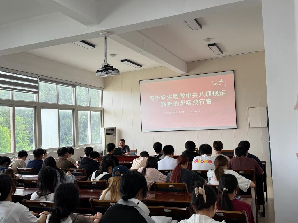 2025年6月20日,信息工程系党总支书记、主任华建祥,在信工楼408会议室为计算机应用技术2401班的全体学生上了一堂生动的形势与政策课。本次课程以“青年学生要做中央八项规定精神的坚实践行者”为主题,旨在引导学生深刻理解中央八项规定精神,积极践行廉洁自律,为未来的成长和发展奠定坚实基础。