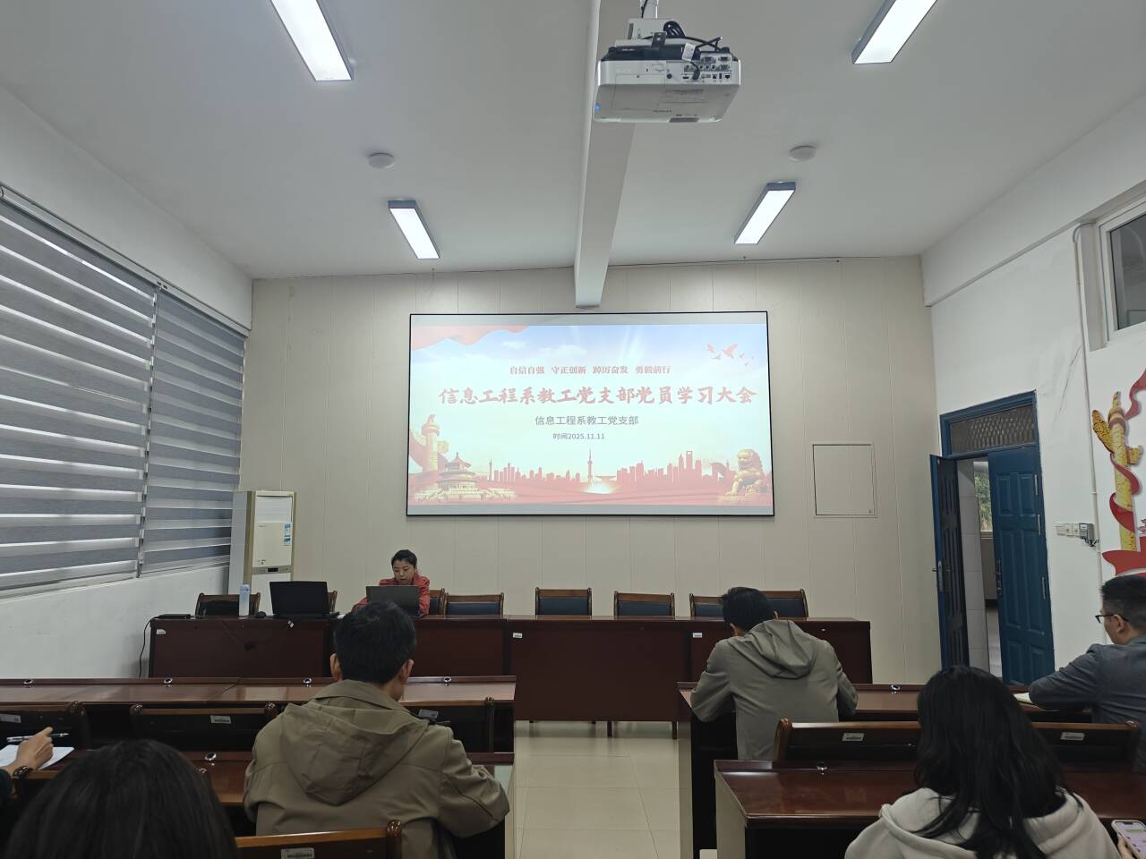 2025年11月11日下午,信息工程系教工党支部在信工楼408会议室召开党员大会,组织开展十一月党员集中学习教育。本次会议由教工党支部书记余慧婷老师主持,全体教工党员参会。