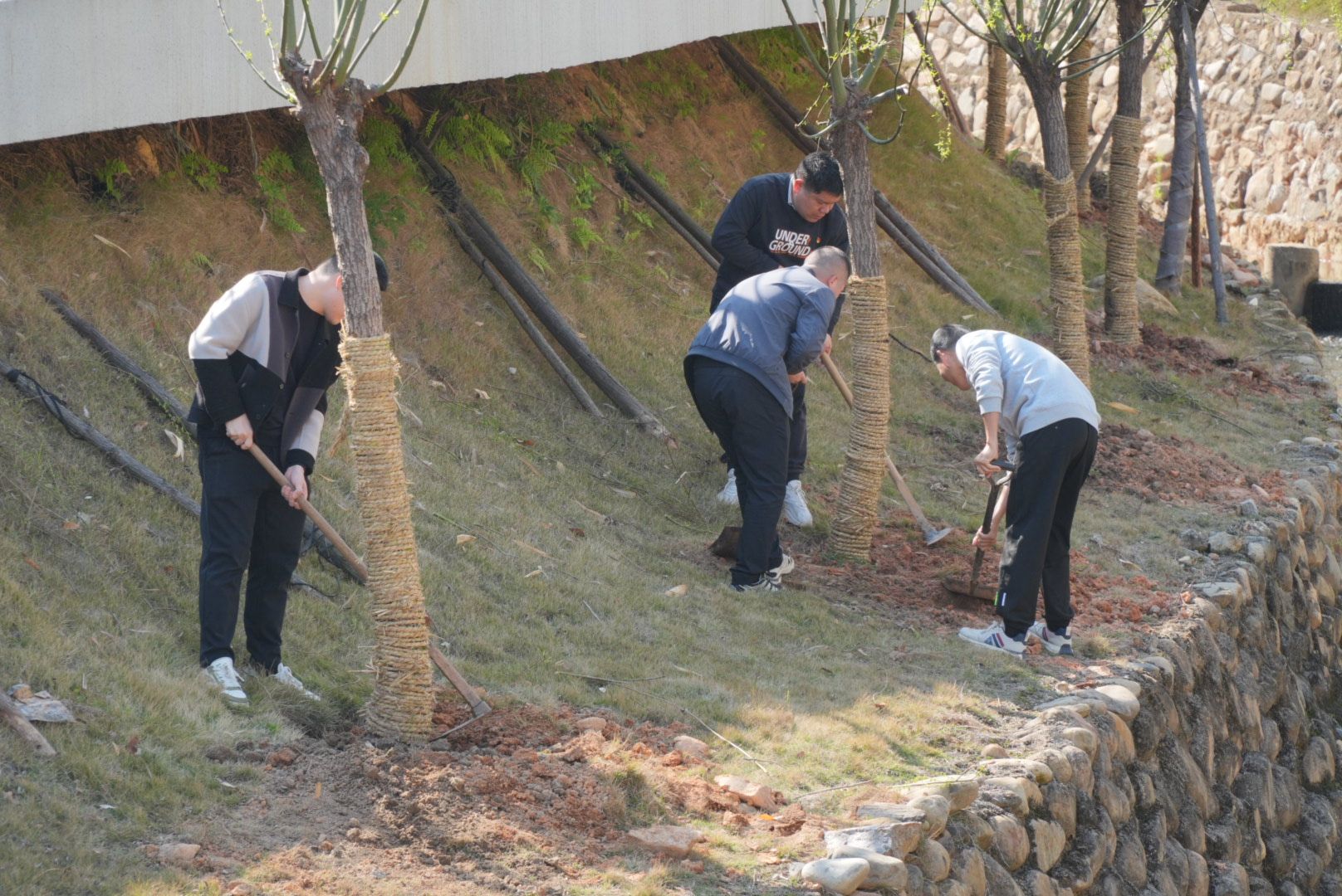 植树现场,大家挥锹挖坑、扶正树苗、培实新土,现场一派热火朝天的景象。