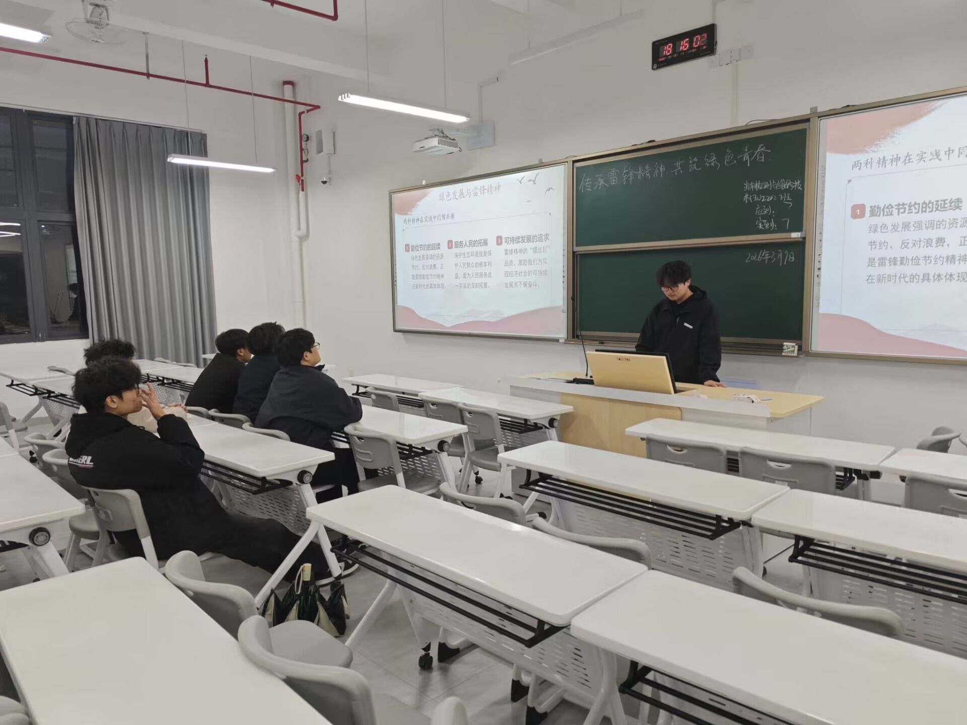 各团支部纷纷开展雷锋精神专题学习,组织团员重温雷锋日记、学习雷锋先进事迹,深刻感悟其爱岗敬业、乐于助人、勤俭节约、无私奉献的崇高品格。同学们结合新时代生态文明建设要求,深入探讨雷锋精神与绿色发展的内在联系,明晰勤俭节约是践行绿色低碳生活的内在要求,无私奉献更是青年投身生态保护、服务社会的精神动力。通过学习与交流,团员们进一步坚定理想信念,将雷锋精神内化于心、外化于行,让崇尚绿色、守护生态成为青春自觉。