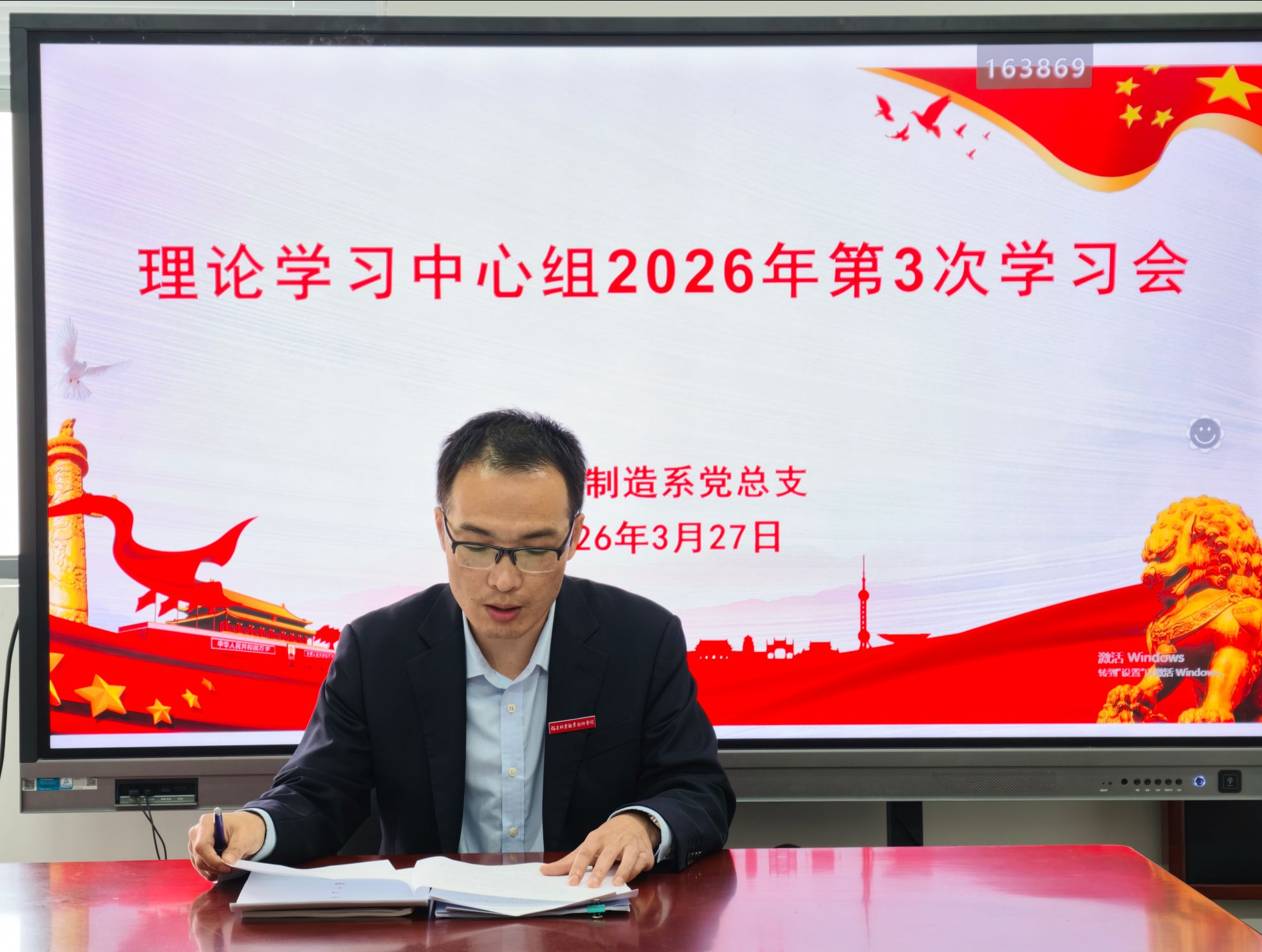 3月27日上午,智能制造系党总支在智造楼4楼会议室召开2026年系党总支理论学习中心组第3次学习会,会议由系党总支副书记(主持工作)林志鹏主持,系党总支委员、各党支部书记参加学习。