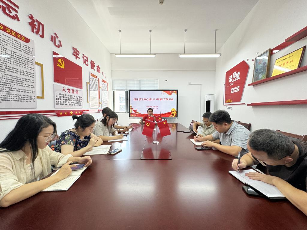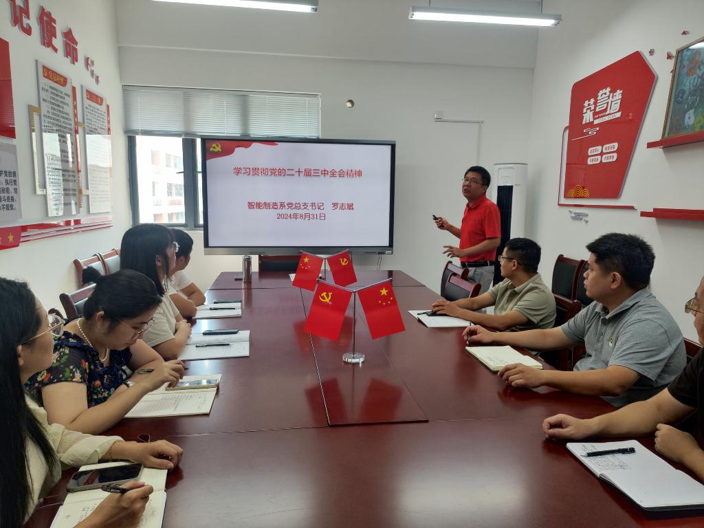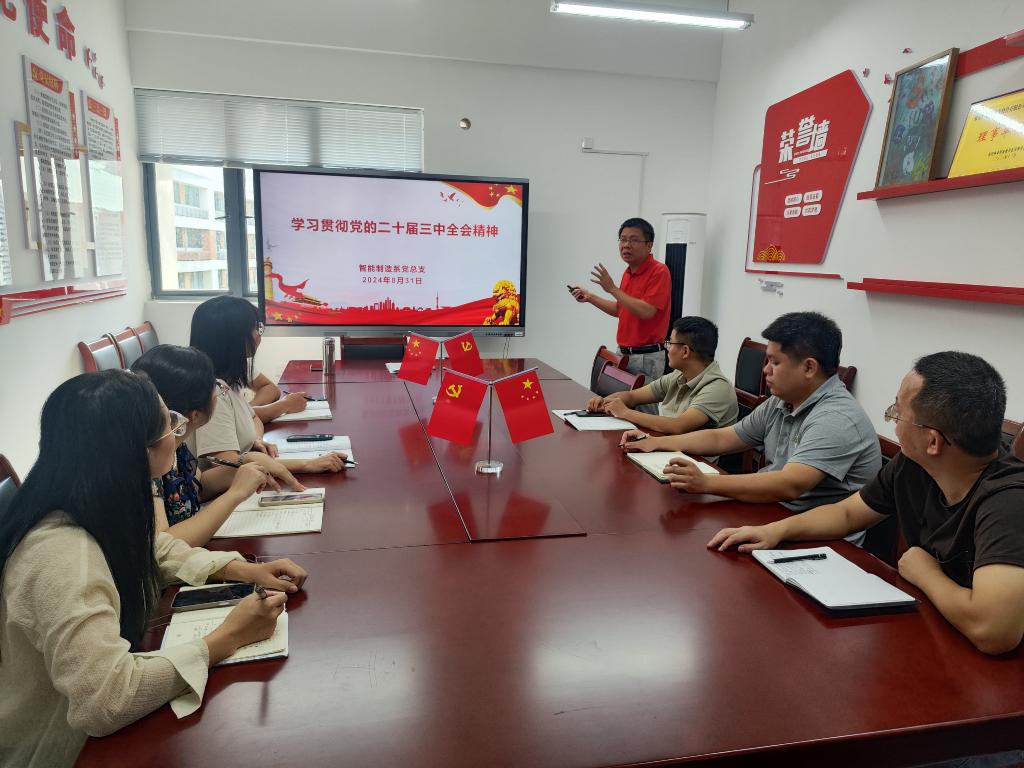 2024年8月31日下午,智能制造系党总支在智造楼4楼会议室召开2024年系党总支理论学习中心组第8次学习会,系党总支书记罗志斌宣讲党的二十届三中全会精神,系党总支委员、各党支部书记共同参加此次会议。