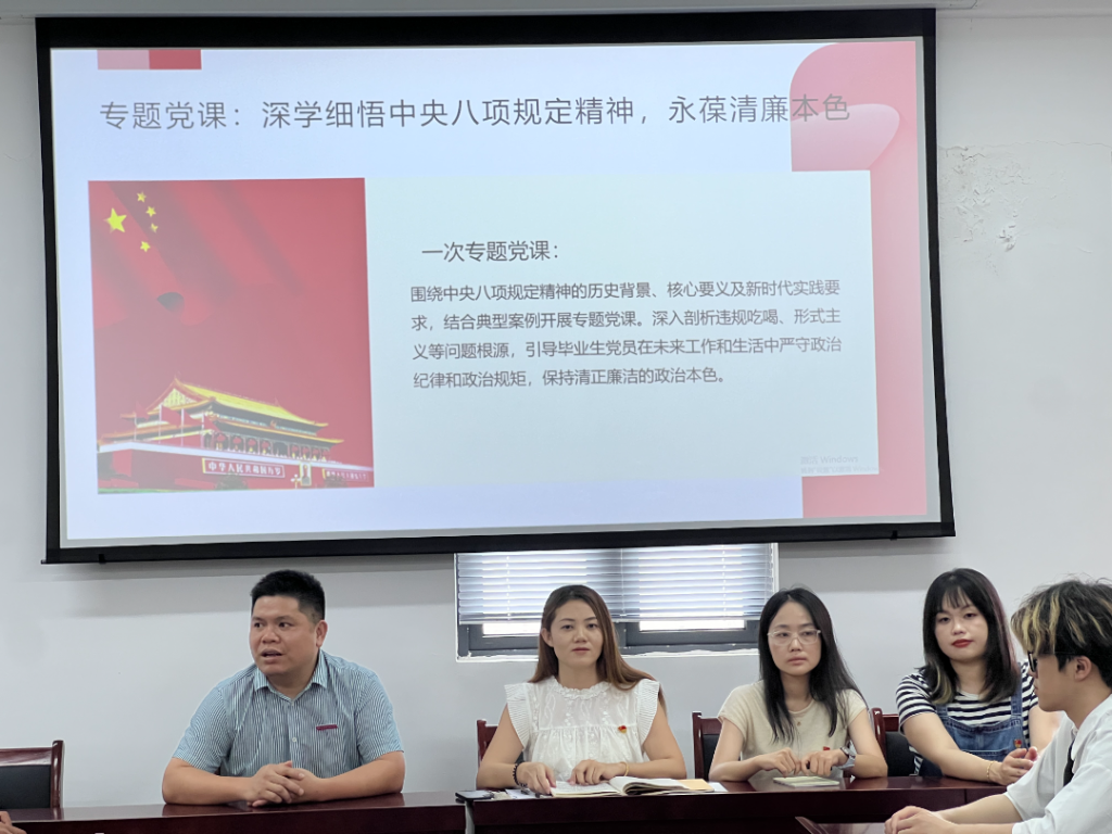 党员廉洁教育是毕业生走出校园前的最后一课,也是进入职业生涯的第一课。支部书记秦英爱为全体毕业生党员讲授《深学细悟中央八项规定精神,永葆清廉本色》专题党课,引导毕业生党员在未来工作和生活中严守政治纪律和政治规矩,保持清正廉洁的政治本色。