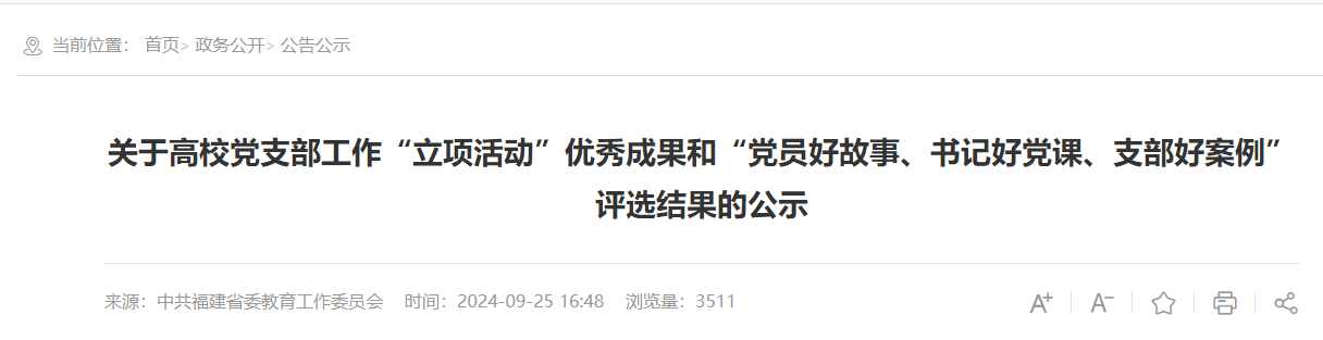 近日,中共福建省委教育工作委员会公布关于高校党支部工作“立项活动”优秀成果和“党员好故事、书记好党课、支部好案例”评选结果,我系学生第一党支部申报的项目《“党建六位一体+网格化”模式下,共建“一站式”学生社区育人实践》(完成人:秦英爱)获高校党支部工作“立项活动”优秀成果三等奖。