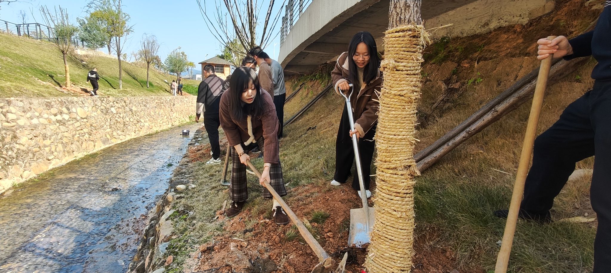 植树现场,大家挥锹挖坑、扶正树苗、培实新土,现场一派热火朝天的景象。
