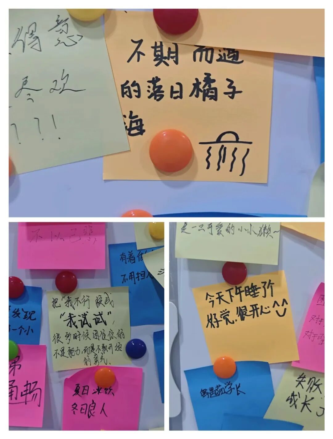 从课堂收获到宿舍温情,从社团协作到个人成长,学生们笔下的幸福瞬间虽微小却真挚,汇聚成了校园里一道温暖的风景线。这些承载着青春美好记忆的便签,不仅成为学生们梳理内心情绪的载体,更让 “幸福” 从抽象的感受变成了可触碰、可分享的具体片段,为校园心理健康建设增添了生动的实践色彩。