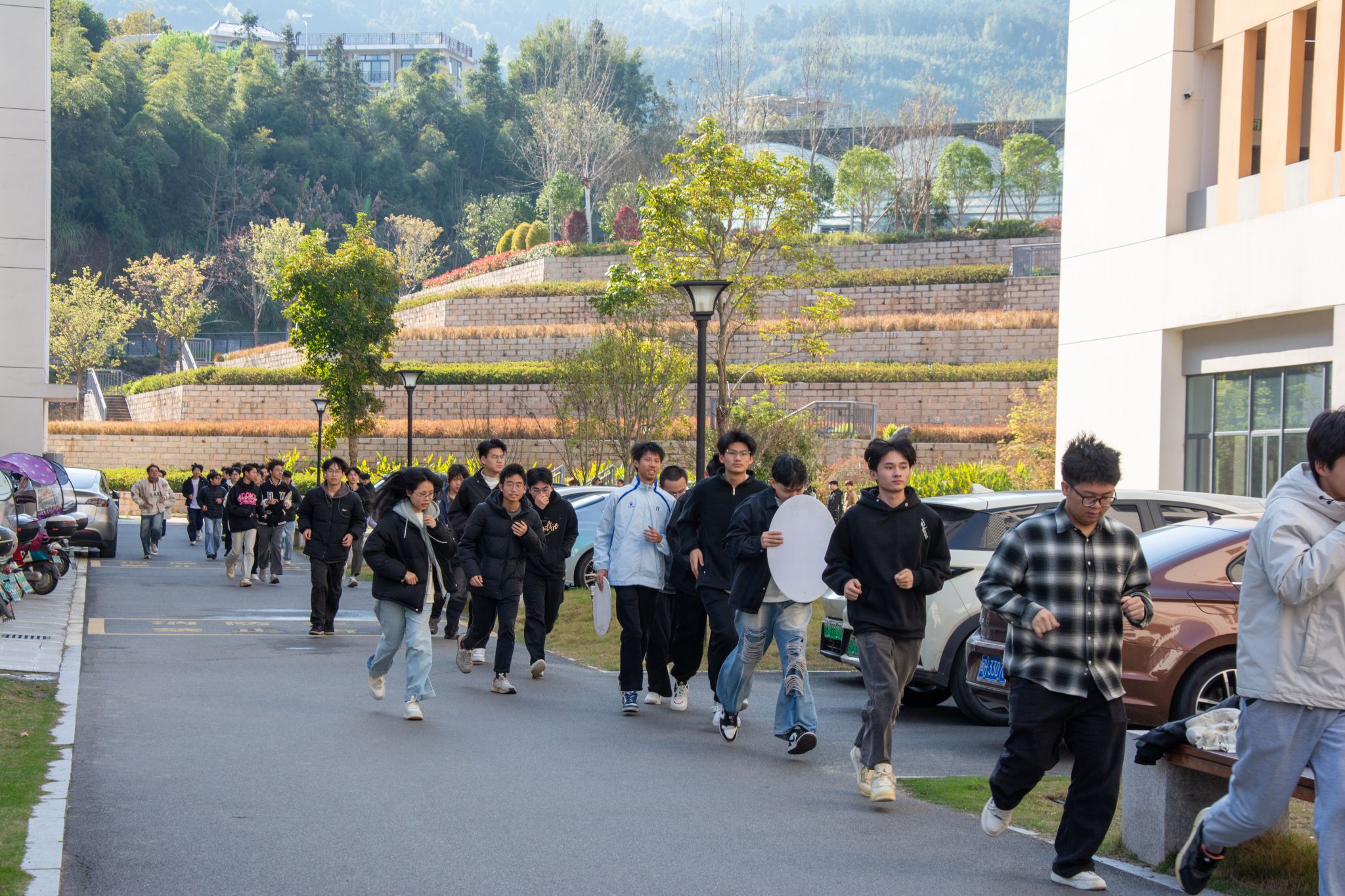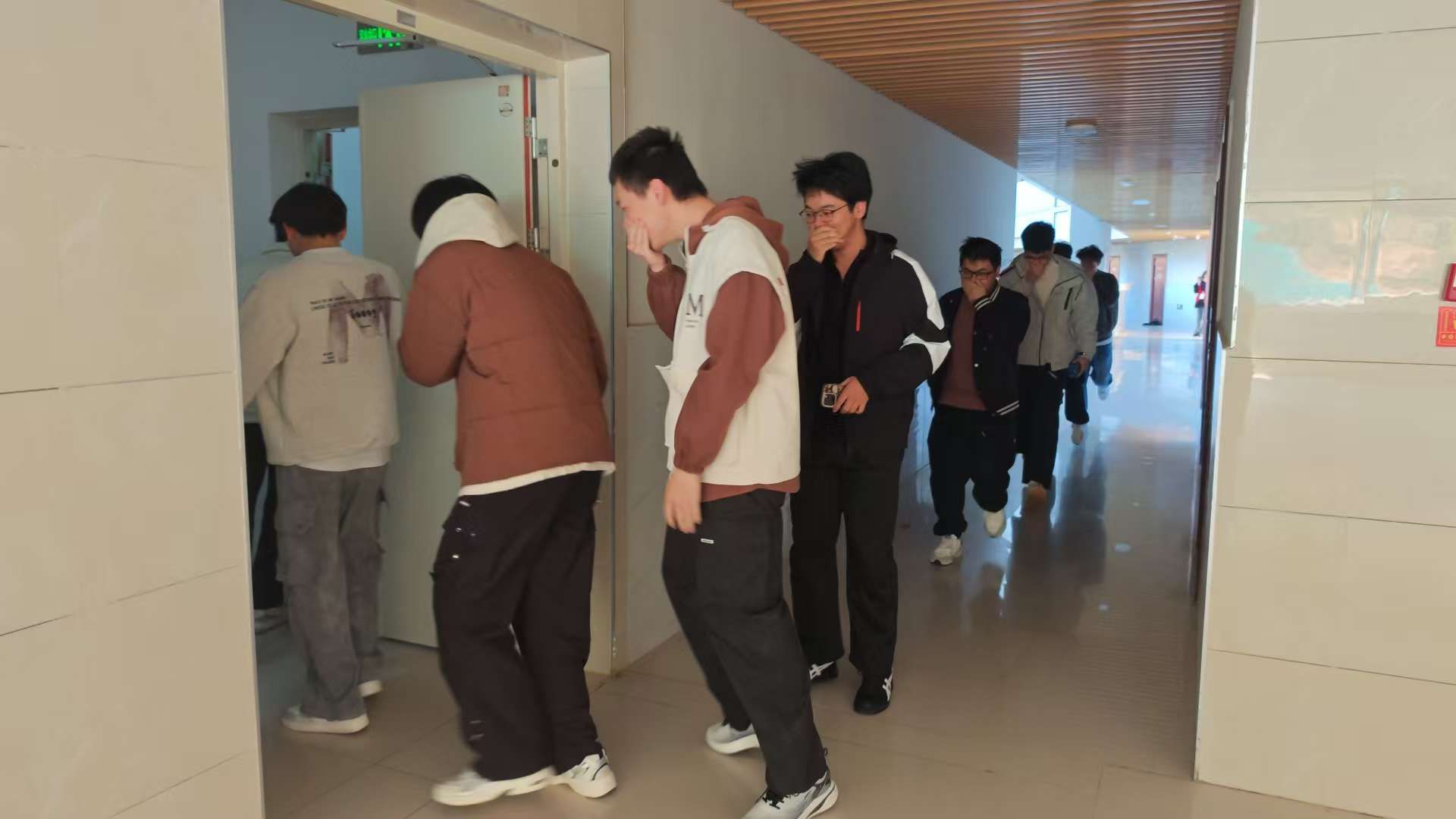 在学生宿舍区域,随着模拟火情警报响起,宿管老师第一时间到位引导,各寝室同学迅速反应,立即停止一切活动,按照预先演练的逃生路线有序撤离。大家自觉用衣物或湿毛巾捂住口鼻,压低身体、快速前行,不推挤、不喧哗、不回头,严格保持疏散秩序。整个过程紧张有序、行动迅速,充分展现了同学们良好的安全意识和应急素养,确保在最短时间内安全撤离到指定集合地点。