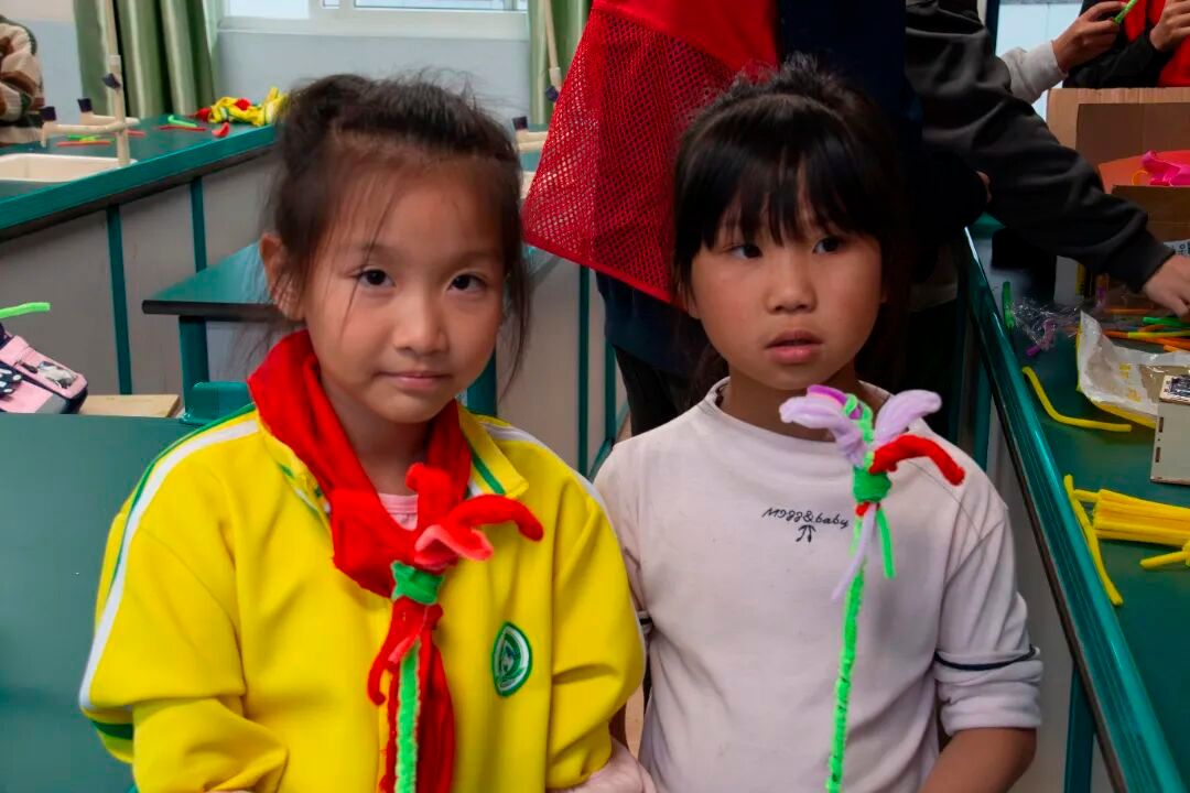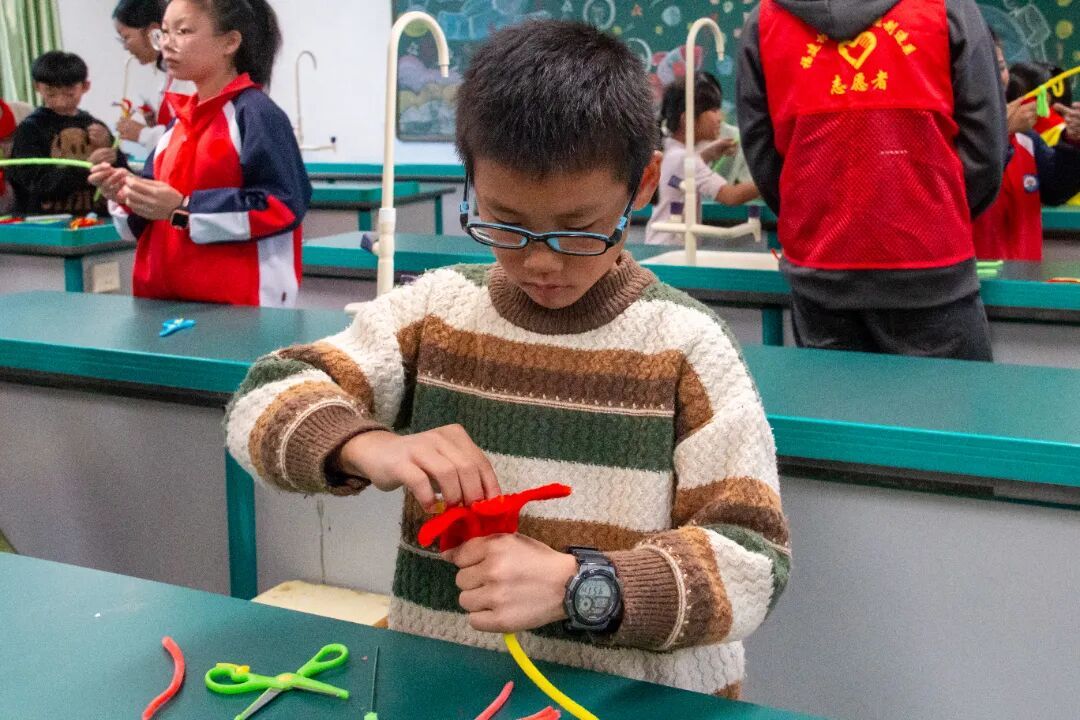 活动中,志愿者们穿梭在孩子之间,或俯身纠正缠绕手法,或帮忙整理材料,孩子们则发挥想象,用手中的扭扭棒勾勒出形态各异的作品,教室里不时响起 “老师你看我做的”“这个颜色搭配真好看” 的欢快交流,轻松愉悦的氛围中,孩子们不仅体验了手工创作的乐趣,更锻炼了动手与审美能力。