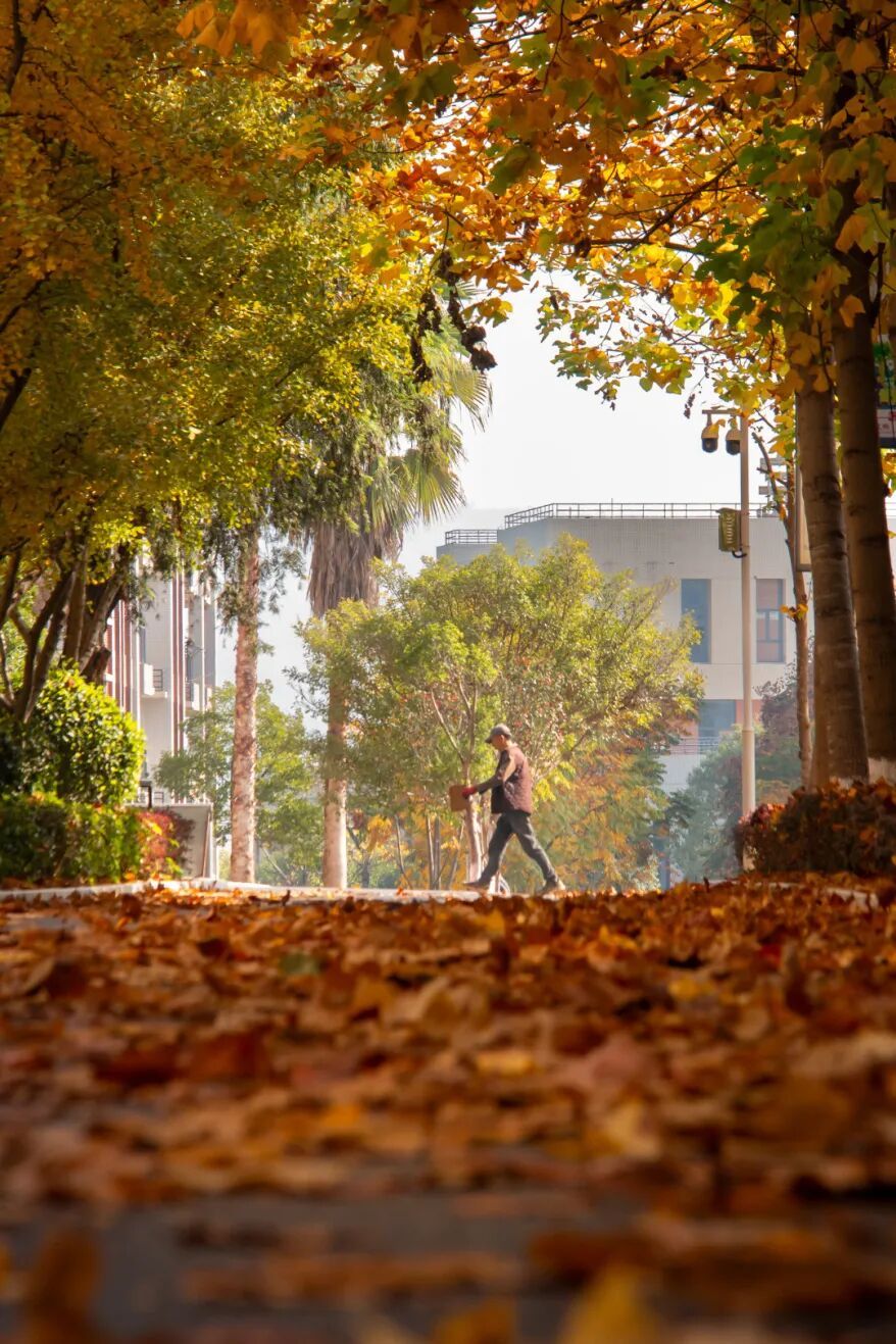 低机位聚焦校园步道,落叶与楼宇形成层次感。秋日午后暖光漫洒,行人悠然穿行,无拘身份,定格校园里平和惬意、满是秋韵的日常瞬间。