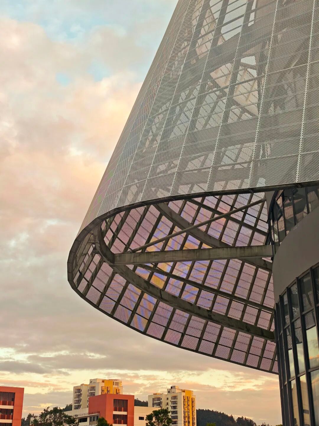 金属网格以渐变孔径编织出倾斜的几何立面,玻璃穹顶由弧形钢梁支撑形成通透的曲面,现代建筑的冷峻线条与晚霞光影缠绕,让钢筋铁骨也浸染了云朵的温柔。