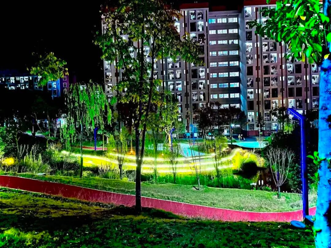 创作理念以宿舍楼作智能产线载体,光轨模拟数据流轨迹,校园夜景里,具象化智能制造“生活场景化”的实训视角,定格专业与日常的融合。