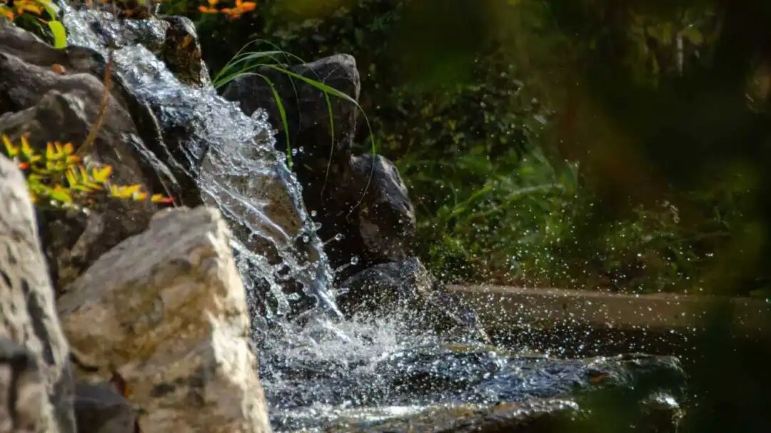 午后光斑里,叠石间细流漫落,溅起碎银似的水花。石缝草叶轻晃,叶尖沾着冬日里的秋橙,湿凉水汽裹着草木香,浸软了透亮的时光。