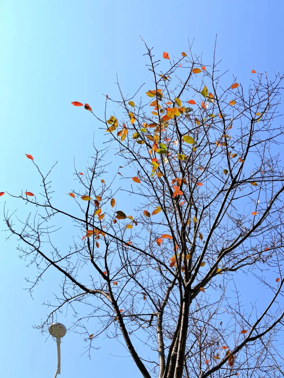 校园隅角的乌桕,残叶蘸秋光晕染枝桠,旁侧智能路灯嵌于景中,是自然肌理与校园智控设施的美学共生。