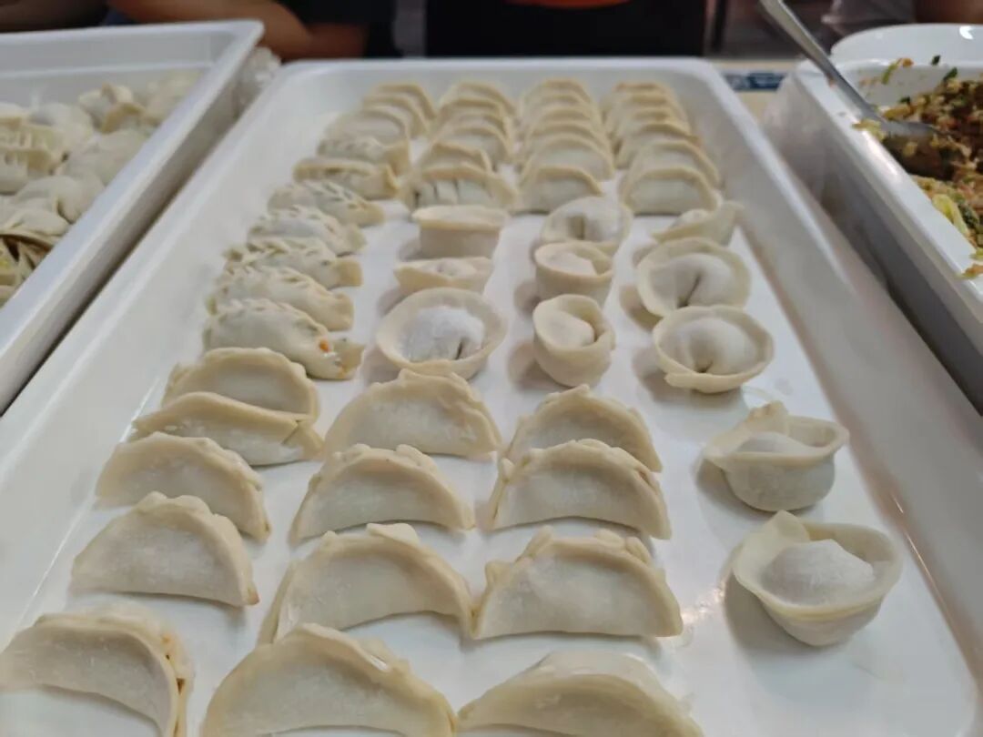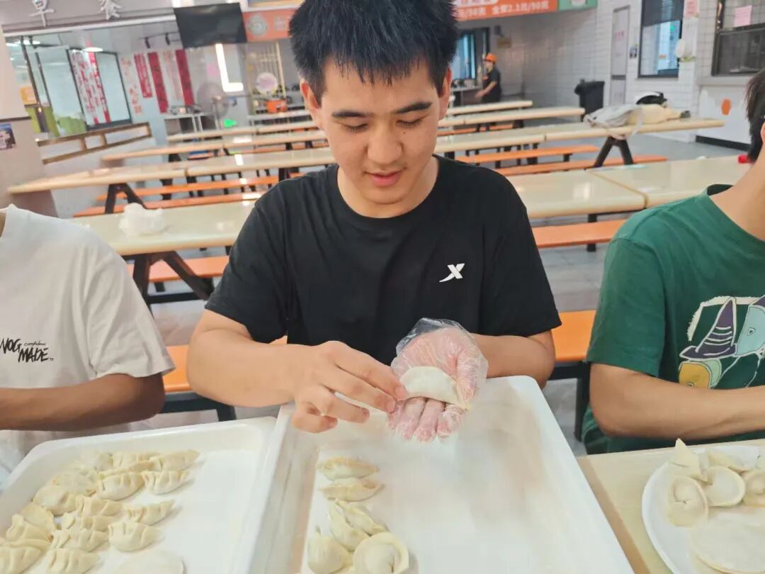 活动现场热闹非凡,食堂师傅提前备好新鲜食材,同学们迅速分组协作:有的专注切菜调馅,有的熟练擀皮捏边,还有的耐心向不同民族的同学传授包饺子技巧。指尖翻飞间,元宝饺、月牙饺、花边饺等形态各异的饺子铺满托盘,欢声笑语中,彼此的距离不断拉近,团结的氛围愈发浓厚。