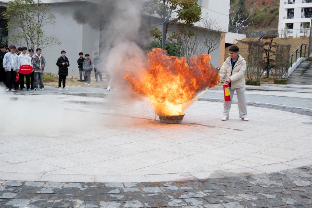 疏散完成后,进入了知识与实践相结合的重要环节。安保处现场教官不仅深入讲解了火灾逃生知识和灭火器的正确使用方法,还生动展示了防爆器材的使用技巧,让学生们对校园安全有了更全面的认识。为了让学生们真正掌握灭火技能,教官邀请了部分学生上台亲身体验使用灭火器。在教官的耐心指导下,学生们成功扑灭模拟火源,切实提升了实战能力。
