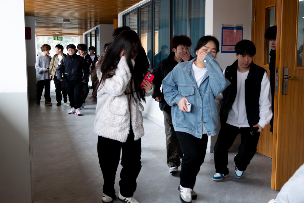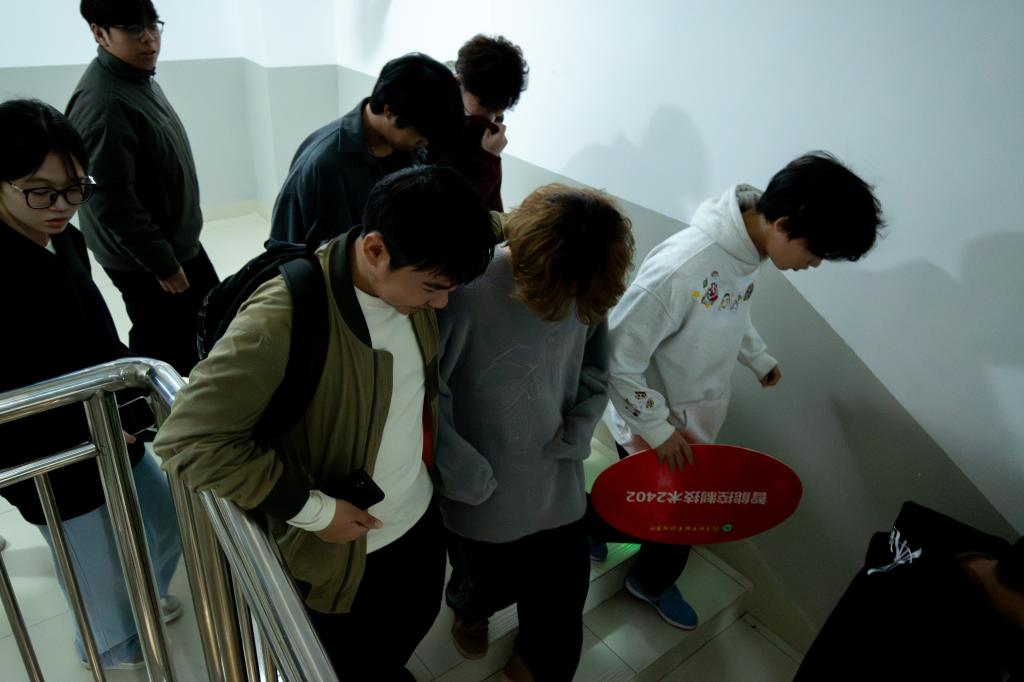 当日中午,演练正式开始。在智造楼,模拟火灾场景迅速点燃紧张氛围,消防警报声瞬间响彻整个大楼。学生们迅速响应,按照预先制定的疏散方案,用手或毛巾捂住口鼻,弯腰低姿,沿着指定的安全通道快速有序地撤离。安全员坚守岗位,在各关键位置引导疏散,确保每位学生的安全。短短几分钟内,全体学生安全集结至指定区域,整个过程紧张有序,充分展现了学生们良好的应急素养。