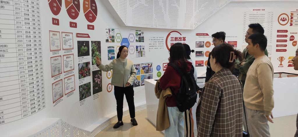 在教务处教务科科长危静美老师的陪同讲解下,大家围绕学院创校办学的发展历程、取得的荣誉、人才培育情况等方面进行了参观学习,了解了学院在党的建设、立德树人、治理水平、内涵建设、三教改革、队伍建设、实训条件、信息化建设、服务能力等方面取得的成果,也对学院其他系部的建设情况有新的认识,激发了老师们对天麟精神的认同感和壮大学院这一宏伟目标的使命感。