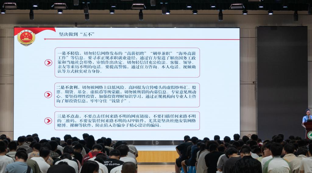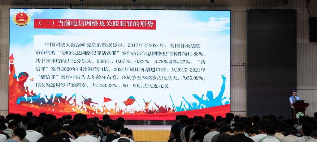 罗作湍副主任首先为同学们分析了当前电信网络诈骗及关联犯罪的严峻形势。他指出,随着互联网的飞速发展,诈骗手段不断翻新,犯罪分子利用大数据、人工智能等技术进行精准诈骗,受害群体日益广泛,其中不乏缺乏社会经验的大学生。他通过一系列数据展示了近年来电信网络诈骗案件的增长趋势,让在场师生深感震撼。