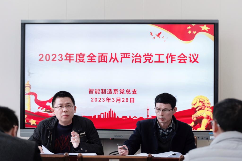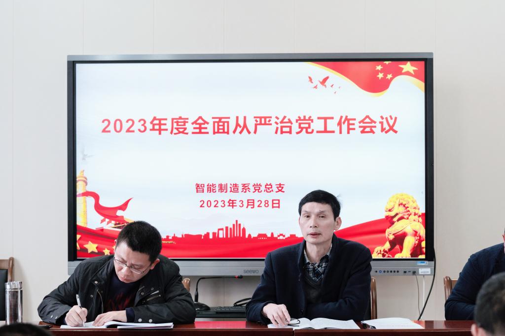 围绕2023年系部全面从严治党工作,谢金生副院长强调,智能制造系全体党员干部要以党的二十大精神为主线,深入学思践悟,树牢理想信念,围绕《智能制造系2023年工作要点》,落实“深学争优、敢为争先、实干争效”行动,充分发挥全国党建工作标杆院系的政治优势、组织优势,以高质量党建引领系部各项事业高质量发展。