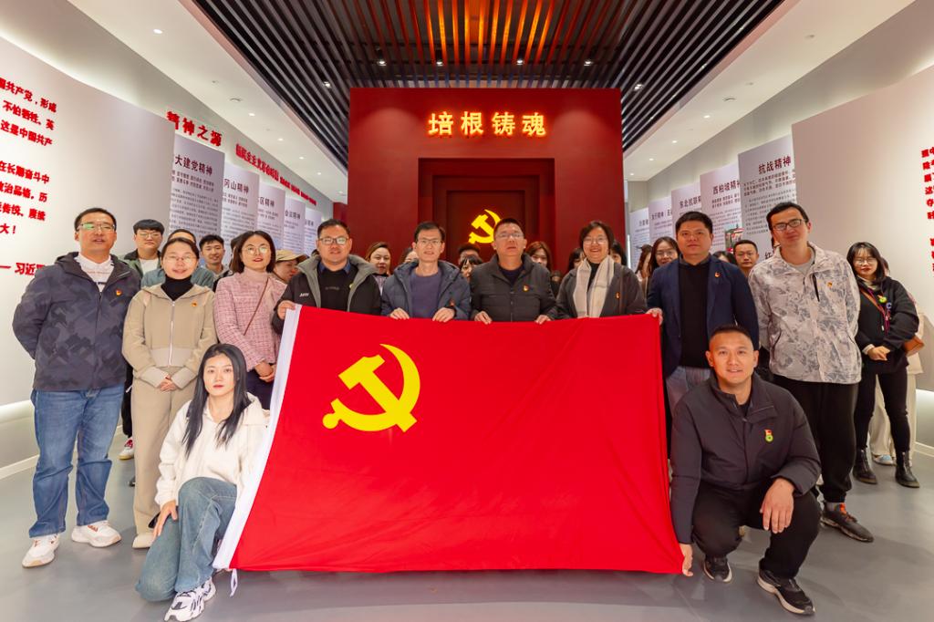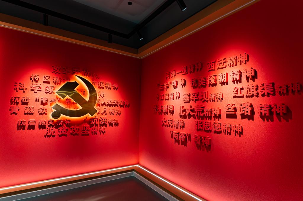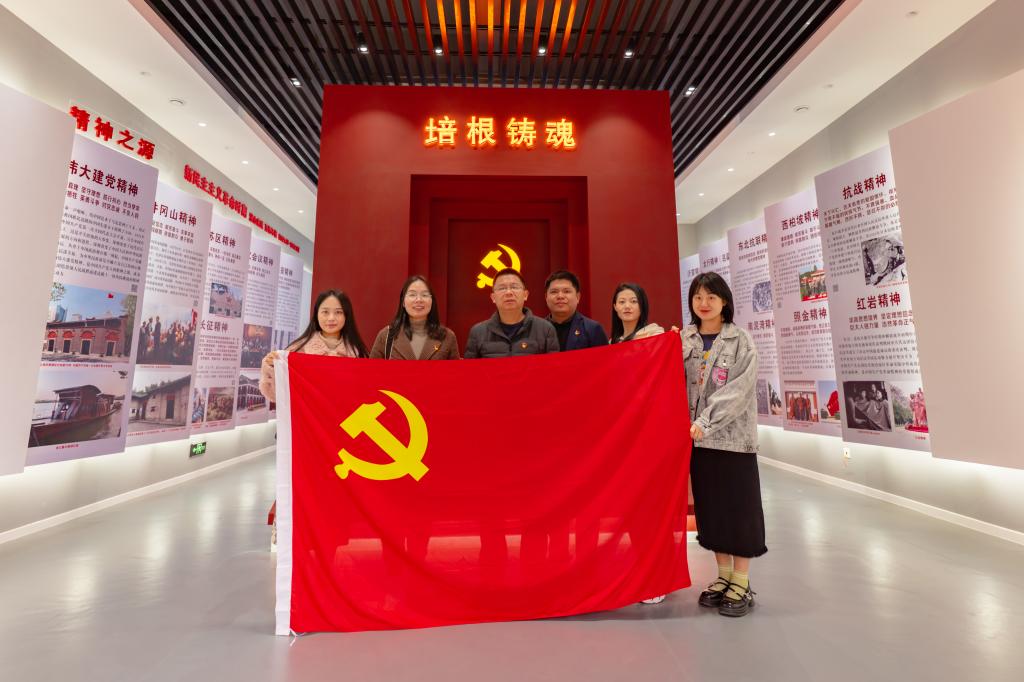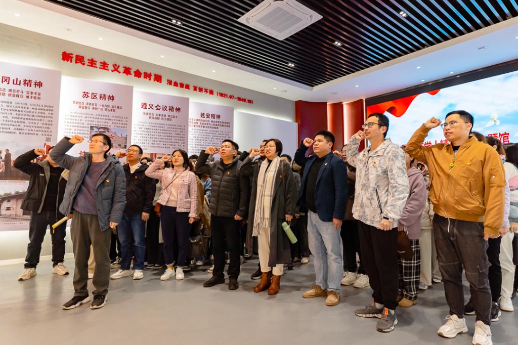 在中国共产党人精神谱系主题馆内,学生工作部部长陈友益带领全体党员面对鲜红的党旗,庄严肃立,重温入党誓词,回忆入党初心。铿锵有力的誓言展示了辅导员们一心向党的崇高理想信念。展馆内通过多维度、多层次、多融合的方式展现了中国共产党在不同历史时期铸就的一系列伟大精神的丰富内涵和精神实质,构造起璀璨夺目的中国共产党人精神谱系。