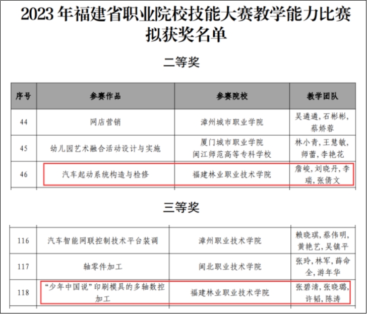 近期,2023年福建省职业院校技能大赛教学能力比赛落下帷幕,智能制造系取得了二等奖1项、三等奖1项的佳绩。其中,詹峻、刘晓丹、李瑞、张倩文的参赛作品《汽车起动系统构造与检修》获得高职专业一组二等奖;张碧清、张晓璐、许韬、陈涛的参赛作品《“少年中国说”印刷模具的多轴数控加工》获得高职专业二组三等奖。