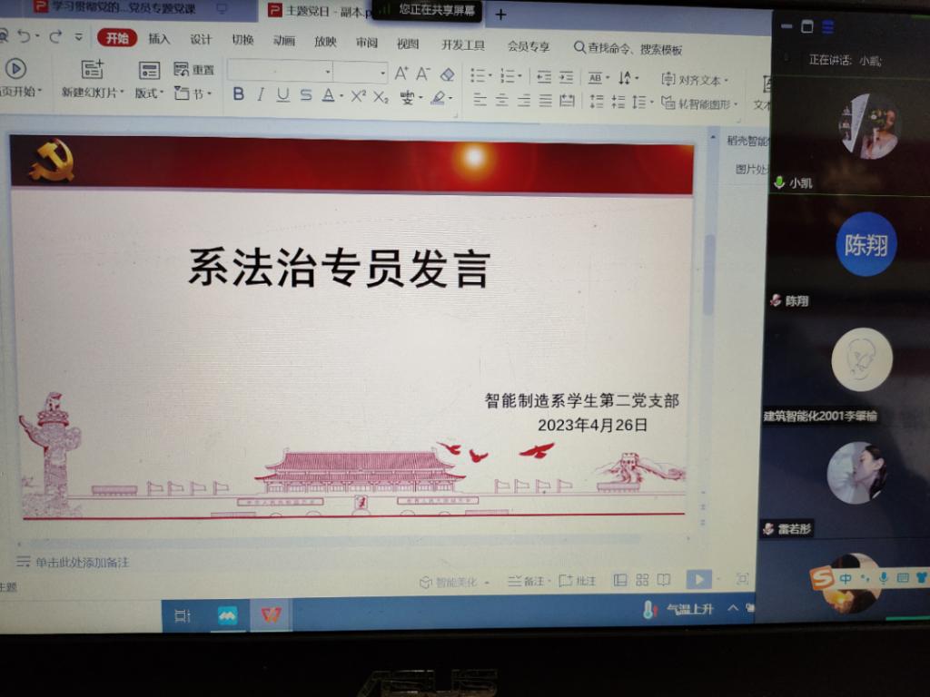 为深入开展学习贯彻习近平新时代中国特色社会主义思想主题教育,牢牢把握“学思想、强党性、重实践、建新功”的总要求,教育引导广大毕业生党员将焕发出来的学习、工作热情转化为攻坚克难、干事创业的强大动力。近日,智能制造系学生第二党支部开展2023届毕业生党员线上教育活动,会议由党支部书记、2023届毕业班辅导员陈邦凯主持,系法治专员、辅导员洪其双以及全体毕业生党员参加了此次活动。