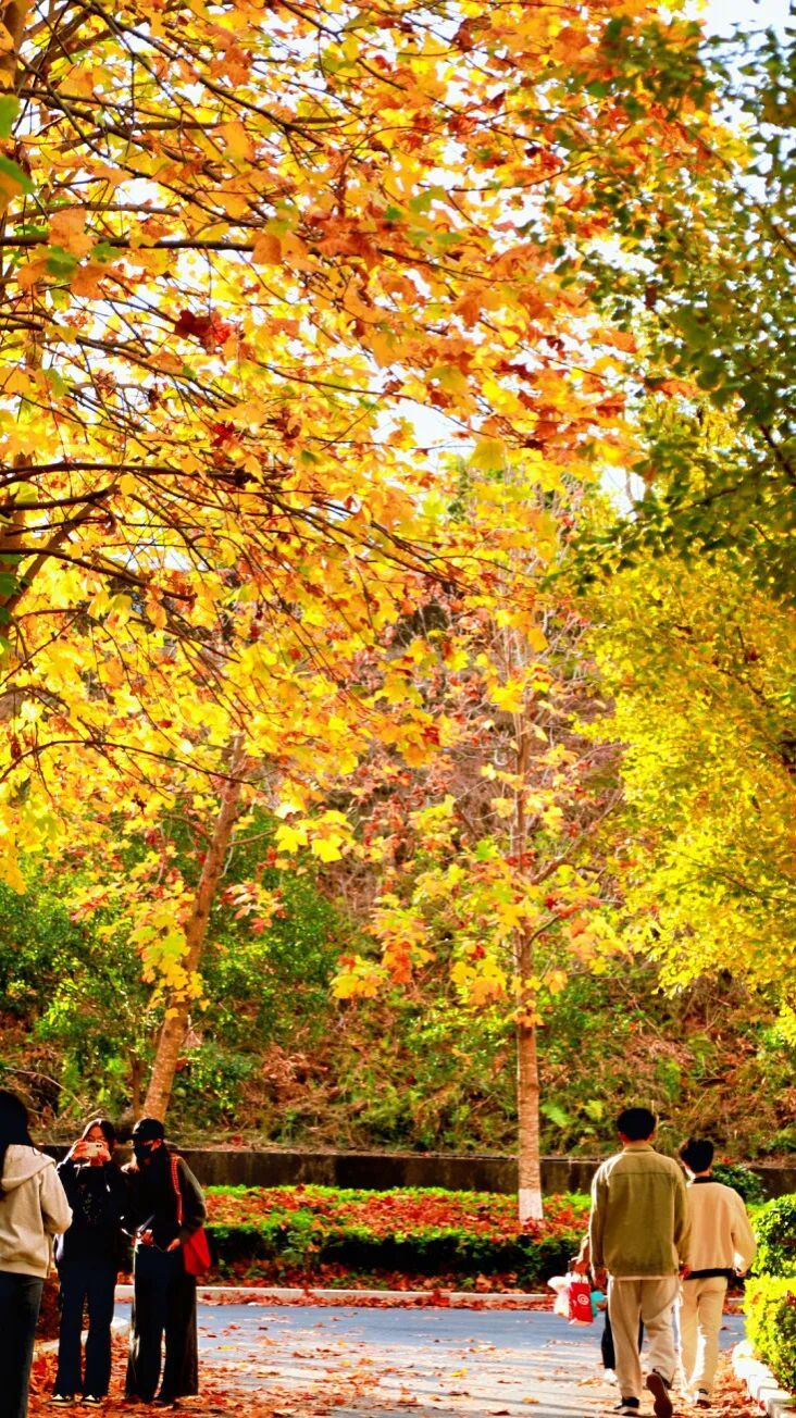 《秋林碎金》:午后校园林荫道,金黄梧桐叶筛碎阳光,落叶与行人的剪影,揉成秋的温柔序章。