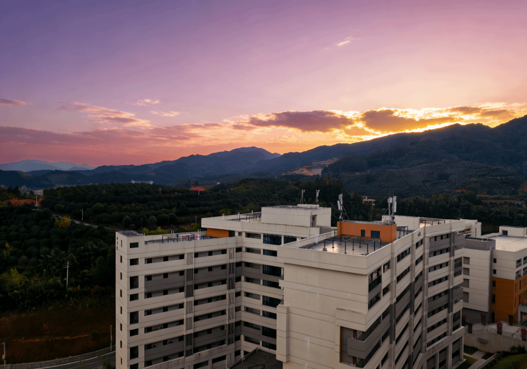 这幅作品定格了校园建筑的黄昏时刻:暖紫云霞漫染天际,楼宇嵌于翠岭间,现代肌理与自然柔韵相融,晕开静谧悠然的氛围感。