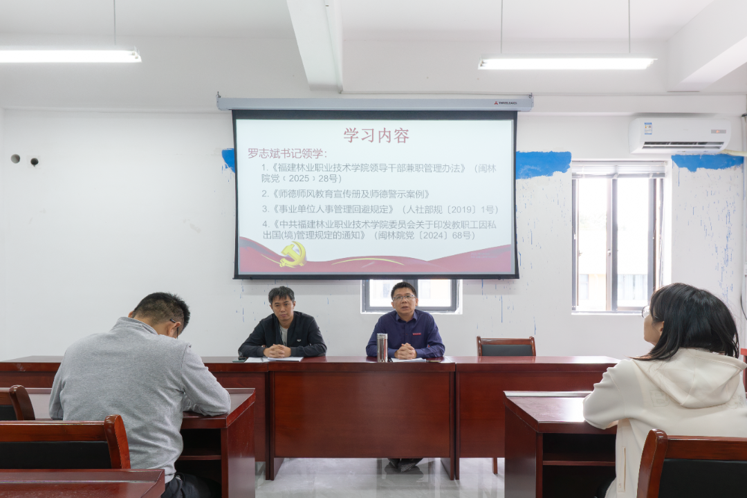 会上,系党总支书记罗志斌领学了《福建林业职业技术学院领导干部兼职管理办法》(闽林院党﹝2025﹞28号)、《师德师风教育宣传册及师德警示案例》、《事业单位人事管理回避规定》(人社部规〔2019〕1号)、《中共福建林业职业技术学院委员会关于印发教职工因私出国(境)管理规定的通知》(闽林院党〔2024〕68号)等文件。