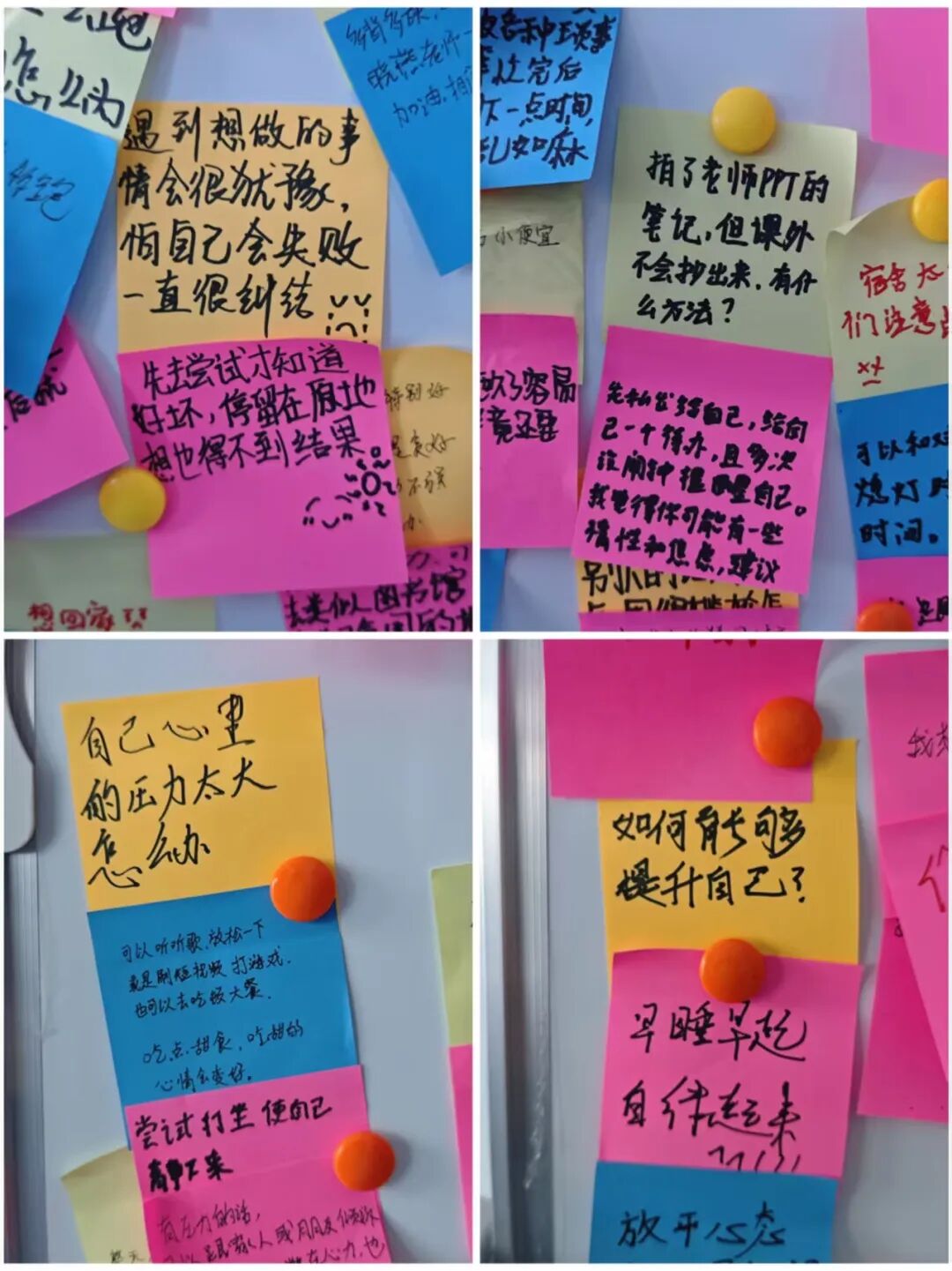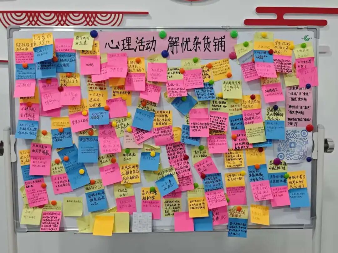 一张张色彩鲜明的便利贴逐渐贴满墙面,有的“烦恼”下汇聚了多条“解忧妙计”,字里行间满是理解与善意。