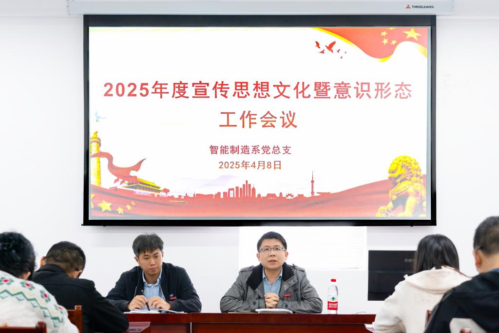 为深入学习贯彻落实党的二十大和二十届三中全会精神,深入贯彻院党委关于宣传思想文化和意识形态工作的部署要求,不断做细做实系部意识形态工作,2025年4月8日下午,智能制造系在系部5楼会议室召开2025年度宣传思想文化暨意识形态工作会议,系党政领导班子、系部全体教师参加了会议,会议由系副主任(主持工作)官飞主持。