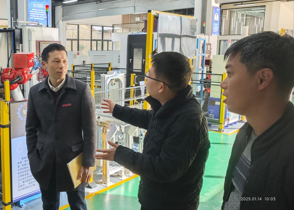 在智能制造系党总支书记罗志斌、系副主任(主持工作)官飞的陪同下,詹书记实地走访调研了系部实训室,走访看望一线辅导员和坐班人员。系党总支书记罗志斌向詹书记汇报了系部党建工作情况、全面从严治党工作情况、学生管理工作情况、辅导员队伍建设情况。官飞主任向詹书记汇报了系部实训室建设、师资队伍建设情况。