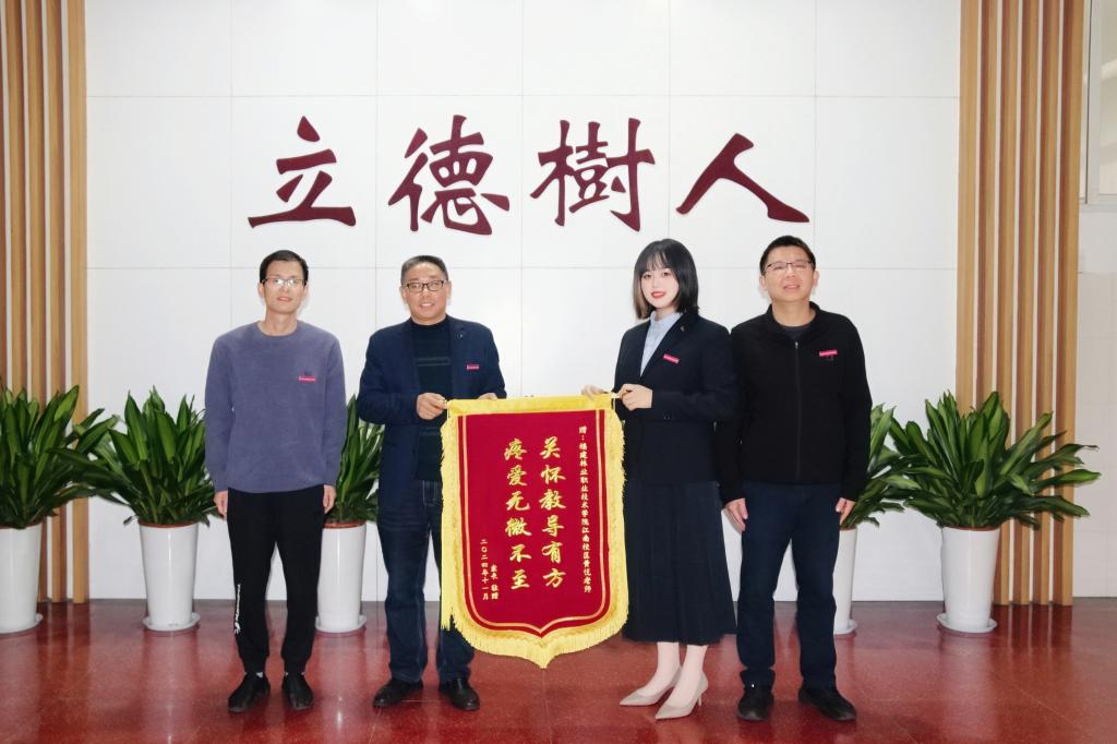 近日,我院收到了一封意义非凡的快递,包裹内装载着一面来自家长赠予的锦旗,以此表达对智能制造系黄悦老师的诚挚谢意。锦旗上,题有“关怀教导有方 疼爱无微不至”的赞誉之辞。这不仅是对黄老师辛勤耕耘、默默付出的高度认可,也是对她无私奉献精神的深情赞美,更是家长对学院立德树人工作所取得的卓越成果的深切肯定。