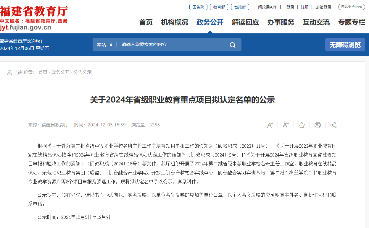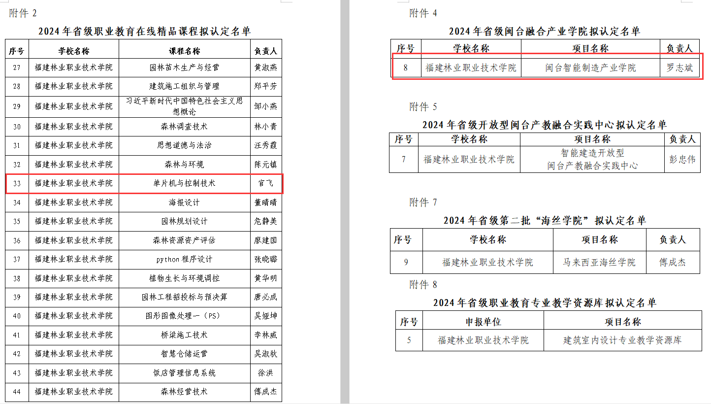 12月5日,根据福建省教育厅发布《关于2024年省级职业教育重点项目拟认定名单的公示》,福建林业职业技术学院智能制造系与漳州灿坤实业有限公司申报的“闽台智能制造产业学院”获批省级闽台融合产业学院;《单片机与控制技术》课程认定为省级职业教育在线精品课程。