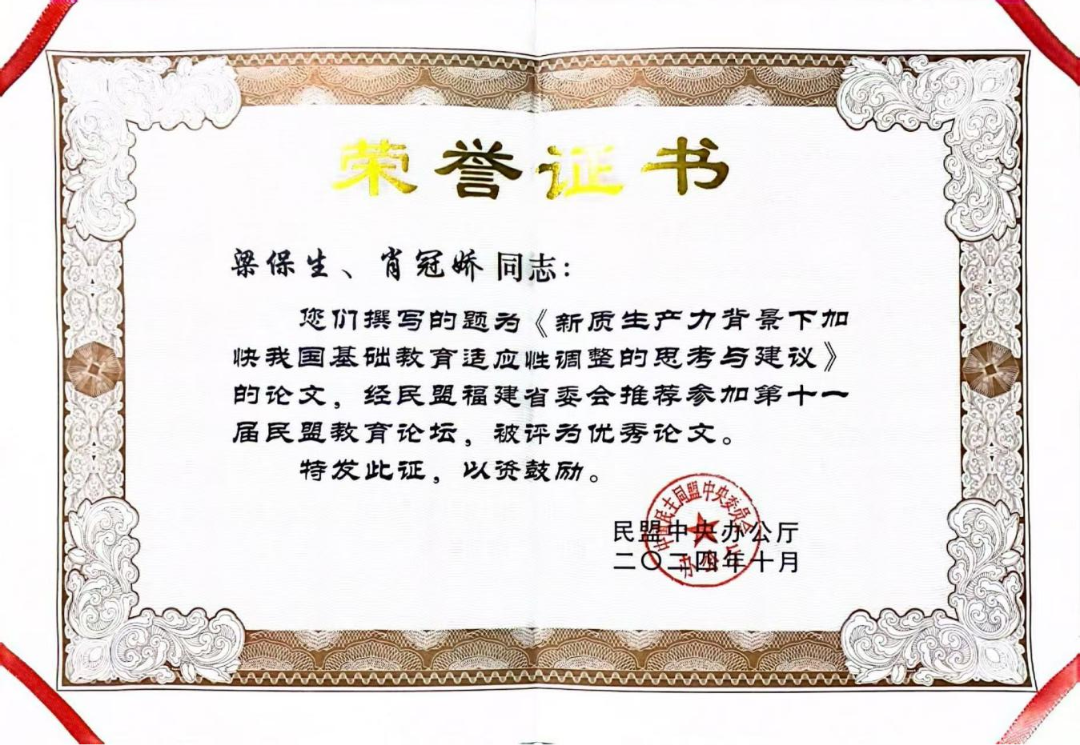 近日,以“深化育人模式改革 加快建设教育强国”为主题的第十一届民盟教育论坛在济南召开,我系梁保生副教授(延平区政协委员、福建林业职业技术学院民盟支部主委)撰写的论文《新质生产力背景下加快我国基础教育适应性调整的思考与建议》经民盟福建省委会推荐参加第十一届民盟教育论坛,获评“优秀论文”。