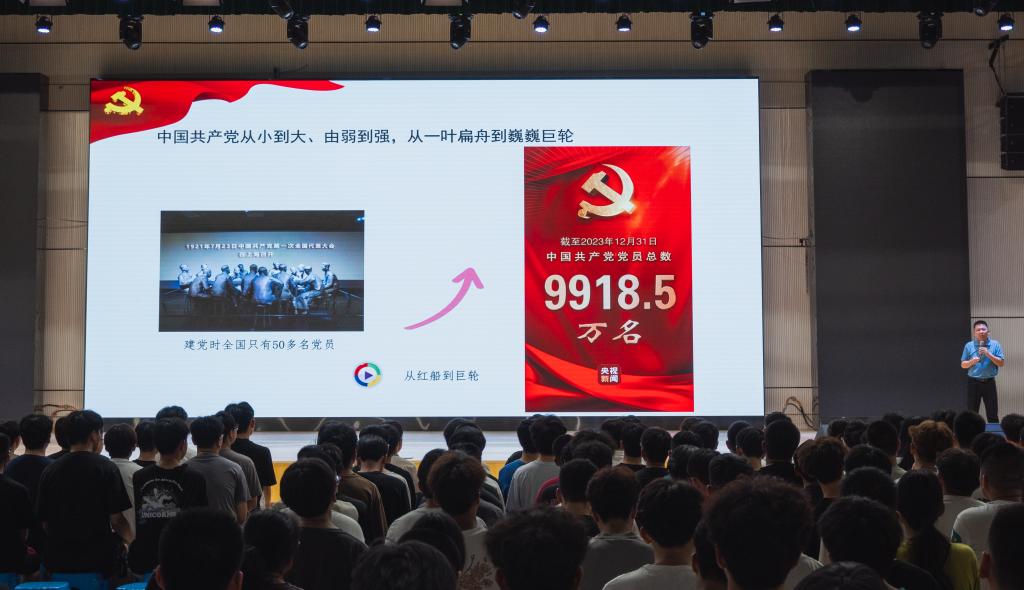 罗志斌书记以深情而有力的语言,带领新生们重温了中国共产党从成立之初的一叶扁舟,到如今成为引领中华民族伟大复兴的巍巍巨轮的辉煌历程。他详细讲述了党在不同历史时期所取得的伟大成就,从革命战争的胜利到新中国的成立,从改革开放的春风到新时代的全面崛起,每一个历史节点都见证了中国共产党人的英勇奋斗和无私奉献。罗书记强调,这些丰功伟绩是党和人民共同创造的,是中华民族伟大复兴的坚实基础。