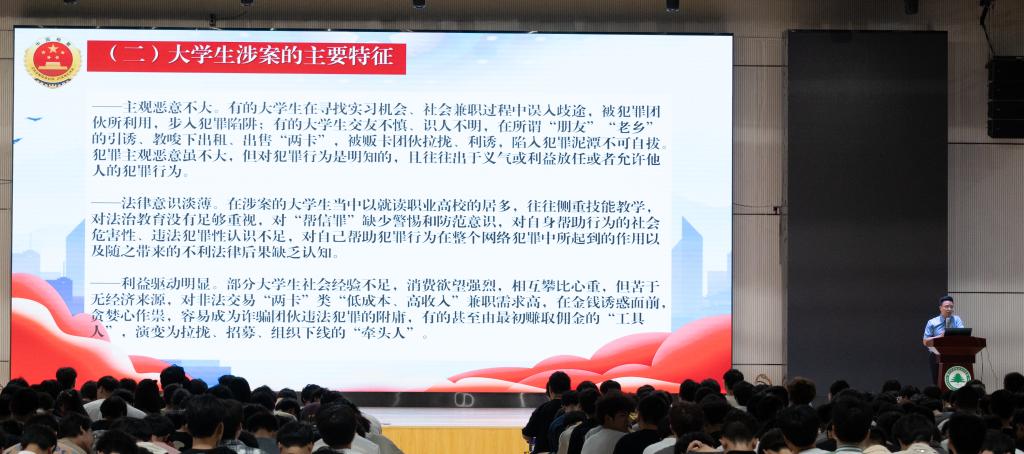 罗作湍副主任首先为同学们分析了当前电信网络诈骗及关联犯罪的严峻形势。他指出,随着互联网的飞速发展,诈骗手段不断翻新,犯罪分子利用大数据、人工智能等技术进行精准诈骗,受害群体日益广泛,其中不乏缺乏社会经验的大学生。他通过一系列数据展示了近年来电信网络诈骗案件的增长趋势,让在场师生深感震撼。