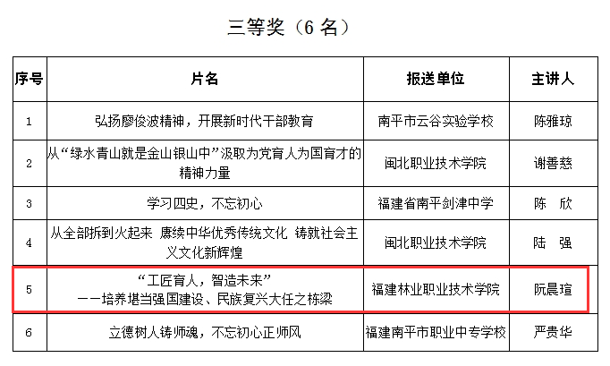 近日,中共南平市委教育工作委员会公布《关于表彰市直属教育系统优秀共产党员、优秀党务工作者和先进基层党组织的决定》(南委教〔2024〕20号)和关于“书记好党课”“支部好案例”“党员好故事”评选活动获奖名单。智能制造系党总支获“先进基层党组织”称号,学生第二党支部申报的作品《“工匠育人,智造未来”——培养堪当强国建设、民族复兴大任之栋梁》(完成人:阮晨瑄)获“书记好党课”三等奖。