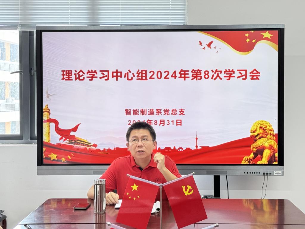2024年8月31日下午,智能制造系党总支在智造楼4楼会议室召开2024年系党总支理论学习中心组第8次学习会,系党总支书记罗志斌宣讲党的二十届三中全会精神,系党总支委员、各党支部书记共同参加此次会议。