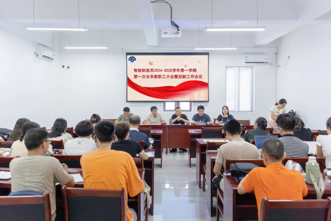 为扎实推进新学期系部各项工作开好局起好步,2024年9月3日下午,智能制造系在智能制造楼5楼会议室召开2024-2025学年第一学期第一次全体教职工大会暨迎新工作会议。系部党政领导班子、全体教职工参加会议,会议由智能制造系副主任(主持工作)官飞主持。