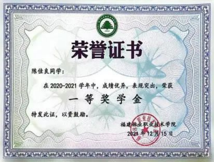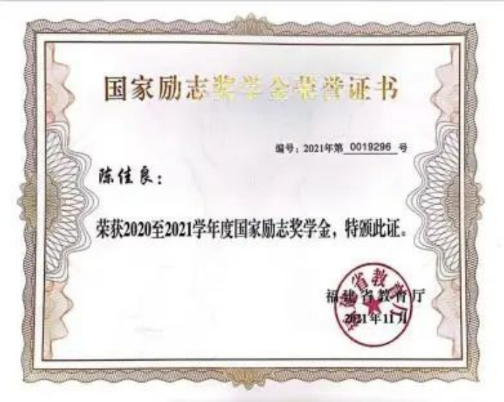 1.2020-2021学年获国家励志奖学金、学院一等奖学金、“三好学生”称号