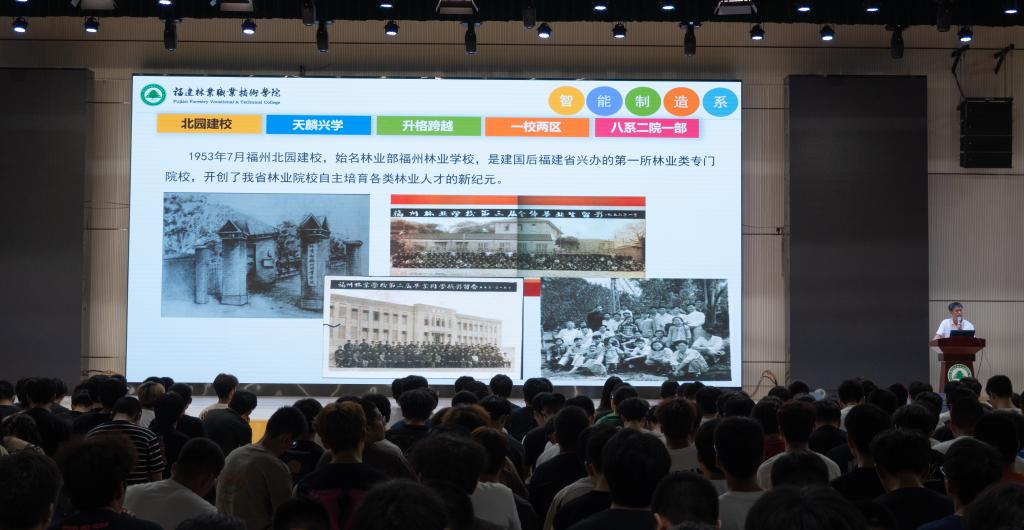 讲座伊始,官飞老师首先带领新生们穿越时光隧道,回顾了福建林业职业技术学院辉煌的办学历程——“天麟兴学,北园建校”,讲述了学院从最初的萌芽到逐步发展壮大,再到“升格跨越,一校两区”的壮丽篇章。他强调,正是历代林职人的不懈努力与卓越贡献,铸就了学院今日的辉煌成就。随后,官飞老师详细介绍了智能制造系的历史沿革与现状,特别提到了系部在“八系二院一部”中的独特地位与贡献,激发了新生们对专业的自豪感和归属感。