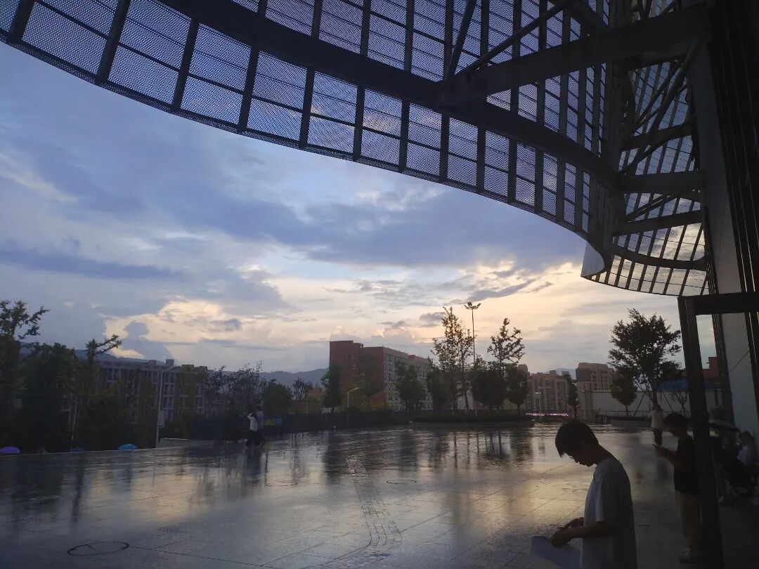 这幅作品定格了校园建筑的黄昏时刻:暖紫云霞漫染天际,楼宇嵌于翠岭间,现代肌理与自然柔韵相融,晕开静谧悠然的氛围感。