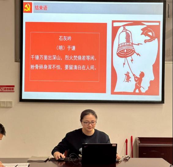 最后,陈莉书记以于谦的《石灰吟》结束本次党课。